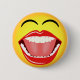 © Sunny Mars Designs Face Pin-Back Button - Este botón, botón, botón, botón, insignia o alfiler fresco, humorístico, divertido, con novedad, cuenta con un gracioso ilustracion de un emoticono facial amarillo riéndose con una boca abierta, dientes brillantes de perla blanca, lengua y ojos cerrados. Concepto de humor.