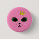 Este botón rosado redondo muestra una cara de gato personalizado con una pequeña corona dorada en la cabeza. El gato tiene grandes ojos verdes, una pequeña nariz rosada y un pequeño corazón rosado en la mejilla. El fondo es de color rosa sólido.