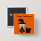 Insignia/botón anaranjados bonitos del feliz Halloween con una bruja sonriente linda del dibujo animado, una araña y un gato negro. El texto es adaptable haciendo clic en el "personalizar él" el botón - cargas de fuentes y de colores para elegir de.