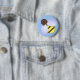 Una abeja amarilla y marrón linda está en un fondo azul de la guinga.