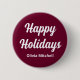 Sólido botón de borgoña oscura / vino tinto oscuro de nuestra "Colección de colores de Navidades rosados de moda". Este elegante botón es la manera perfecta de añadir un toque de alegría festiva a su conjunto vacacional. El texto "Felices Fiestas" es personalizable y también el nombre puede ser personalizado.