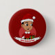 Botón redondo con el ilustracion de un lindo sonriente y feliz muchacho, está usando el traje rojo y blanco de Santa Claus y sosteniendo un regalo; con plantilla de texto editable para tu nombre o mensaje, Navidades diseño de vacaciones con fondo rojo