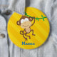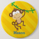 Botón personalizado/Pin que ofrece un mono divertido en la selva con un fondo amarillo de la raya. Diseño lindo y de la diversión para el special para los muchachos. Regalo con monograma de encargo. Para ninguna personalización, suprima el texto de la muestra y deje el espacio en blanco.