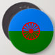 Bandera oficial gitana del viajero de verde y azul representando la tierra y el cielo con una rueda de vagón roja, representando el viaje.
