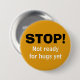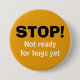 Moderno botón amarillo gamboge con un simple mensaje que dice STOP, NO LISTO PARA LOS HUGS AÚN en tipografía blanca y negra. El texto blanco es PERSONALIZABLE, así que puedes crear tu propio mensaje personal de 'Mantener alejado'! Una manera ideal de aclarar el dilema del abrazo o codo. Disponible en otros colores.