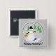 Snowman está paleando la nieve usando su sombrero de cabeza. Los pinos están al fondo. El 3d globo se destaca sobre el fondo gris del botón. "Felices Fiestas" está escrito debajo.