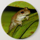 Fotografía de una rana arbórea sonriente linda que cuelga sobre una hoja de la palmera, exhibida en un botón. --- La fotografía es con derechos de autor por el fotógrafo, Christina Spiegeland.