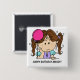 ¡Un pequeño chica trigueno con un globo y una camisa rosados del azul y de la lavanda en un botón que usted puede modificar para requisitos particulares con su opción del texto, su nombre, y edad! ¡Perfeccione para todos que estén asistiendo a la fiesta de cumpleaños!