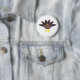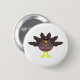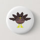 Este botón presenta un personalizado de un pavo con ojos negros grandes, un pequeño pico amarillo y plumas de cola pegadas. Los pies están en direcciones opuestas, lo que hace que el pavo parezca ridículo. El pavo tiene un texto rosado en el vientre que dice "Feliz Día de Acción de Gracias" y parece que las plumas han sido arrancadas para revelar el mensaje.