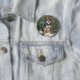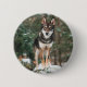 Botón Wolfdog. Hermosa foto de Wolfdog Nox, de pie sobre una roca, Bois de Vincennes, París, Francia. Foto de Tahoe Beetschen.