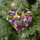 Un adorno en forma de corazón de bonito con un collage de botones morados y arcos amarillos.
