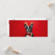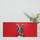 Sur la face avant :Bouledogue Français noir et blanc au nœud papillon rouge et des bois de renne dorés, sur un fond rouge. Le style est amusant et décalé.