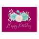 Una tarjeta de felicitación de cumpleaños con fondo magenta. Un ramo de color pastel en la parte superior. Las flores, las hojas y las brotes son de color rosa pastel y verdes. Creado con pintura de acuarela y digitalizado.