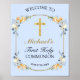 Bienvenido a su familia e invitados a la Primera Recepción de Comunión Santa de su hijo con este elegante Poster de Señales de Bienvenida de Niños de la Primera Comunión. El diseño es de un fondo azul claro con un marco dorado acentuado por bonitos ramos de flores azules, cremas y rosas de melocotón. Dentro del marco se encuentra una cruz de oro exquisita. Personalice este poster de bienvenida con el nombre de su hijo y la fecha de la recepción de su comunión.