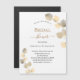 Un fondo blanco decorado con brotes de eucaliptos dorados. Personaliza y el nombre de la novia a ser y los detalles del fiesta. Letras de color negro y dorado.