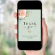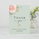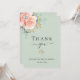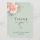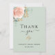 Un fondo verde sabio. Decorada con oro rosa, flores rosadas, flores (rosas) y hojas de eucalipto de color agua verde, brotes, vegetación y brotes de oro falso. Guión con letras a mano grande y el texto: Gracias. Personalice y agregue su nota de agradecimiento y nombre.