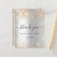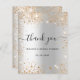 Una tarjeta de agradecimiento para una ducha de novia. Un falso fondo metálico plateado. Con polvo falso purpurina de oro. En el frente del guión con letras a mano y el texto: Gracias, tu texto, título y una fecha. Atrás: Personaliza y agrega tu nota de agradecimiento y nombre.