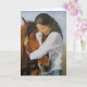 Esta tarjeta de saludo muestra una reproducción de mi pintura original de aceite de Bridget y su caballo de rescate.