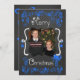Un fondo de pizarra con hermosos rollos y estrellas de brillante texto azul y blanco que dice "Feliz Navidad" delante y "Que todos tus días sean alegres y brillantes" detrás. Esta hermosa tarjeta personalizada de fotos navideñas de vacaciones tiene varios adornos estelares, y un pájaro en un diseño de nido y áreas que puedes fácilmente agregar tus nombres, el año actual, y foto!
