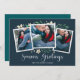 Elegante y festiva tarjeta fotográfica navideña enmarca tres de tus fotos cuadradas favoritas con un sutil borde de borde enredado y follaje verde y blanco de vacaciones mirando por las esquinas. "Los saludos de la temporada" aparece en la parte inferior en la escritura de caligrafía blanca, con sus nombres y el año por debajo.