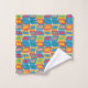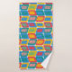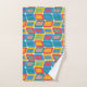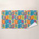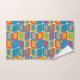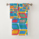 Este conjunto de toallas tiene un diseño moderno de mediados de siglo de colores brillantes que hacen rectángulos redondeados con otros rectángulos dentro formados por una colección de líneas.