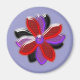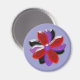 Este imán de bonito presenta una imagen digital de una flor de margarita con pétalos de color púrpura, rojo y negro con un centro púrpura. Los pétalos parecen hechos de plástico brillante que ha captado la luz y causado un efecto iridiscente. El fondo es de un color azul calmante.