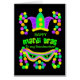 Tarjeta de felicitación Mardi Gras de colores vivos para la abuela, con corona, máscara y una cadena de cuentas en verde brillante, violeta y amarillo sobre un fondo negro. Puede cambiar el mensaje interno si lo desea.