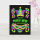Tarjeta de saludo Mardi Gras de colores vivos para un marido, con corona, máscara y una cadena de cuentas de color verde claro, morado y amarillo sobre un fondo negro. Puede cambiar el mensaje interno si lo desea.