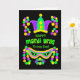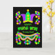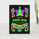 Tarjeta de saludo Mardi Gras de colores vivos para un hijo, con corona, máscara y una cadena de cuentas en verde brillante, violeta y amarillo sobre un fondo negro. Puede cambiar el mensaje interno si lo desea.