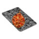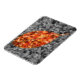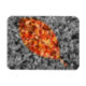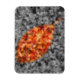 Fotografía de otoño, de color selectivo, de hojas de mito de crepe caídas, con forma de hoja enmarcada en oro de rojo brillante, naranja y amarillo sobre un fondo blanco y negro.