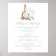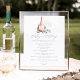 Un encantador menú de cata de vinos botánico muestra sus selecciones de vino coronadas por una botella de vino rosado con las iniciales de la pareja inscritas, y dos copas de vino sobre un lecho de hojas de eucalipto y follaje de acuarela verde. Diseñado para coincidir con nuestra colección de invitaciones Cheers to Love.