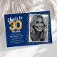 Celebra el gran hito de cumplir treinta años con nuestras elegantes invitaciones de fiesta de cumpleaños. Con un fondo azul trendy personalizable, un lugar para una foto personal y acentos dorados, estas invitaciones seguramente dejarán una impresión duradera. Los detalles de globo de helio dorado añaden un toque de magia, mientras que la plantilla de texto de cumpleaños número 30 moderna es increíblemente fácil de personalizar. ¡Porque el estilo no tiene límite de edad!