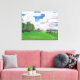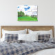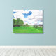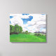 En este cuadro paisajístico se representan las nubes de un cielo azul en un día de verano luminoso y soleado. Una brisa de aire fresco corre a través de las colinas, árboles y prados, llevando un toque de niebla hacia las montañas a lo lejos. El paisaje de las nubes de los cúmulos corre por encima y se abre al cielo azul y a la luz del sol brillando sobre los vibrantes campos verdes de césped. El aire es fresco pero no frío, y el sol es cálido pero no caliente. Hay una energía en el aire y un movimiento pacífico al viento y pasando blanco y azul por encima. Es un día fácil de recorrer, o estar quieto y quedarse en un lugar.