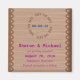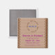 Mezcla de lo femenino y lo rústico, este singular salva el imán de dátiles con encaje marrón sobre un fondo de madera y detalles bodas escritos en marina y magenta.