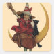 Imagen vintage de una bruja con su escoba y gato negro sentado en una luna creciente.