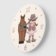 Una vaquera con el pelo castaño y el reloj de pared de caballo.