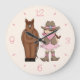 Una vaquera con el pelo castaño y el reloj de pared de caballo.