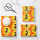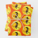 bruja de bonito sobre un palo de escoba en una luna amarilla. El fondo es naranja. Feliz Halloween