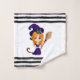 Una toalla de baño con una bruja linda que lleva un gran gorra de brujas moradas. Su gato negro descansando sobre su cabeza. Ella tiene el pelo largo naranja y lleva una escoba. El ilustracion personalizado es perfecto para halloween.