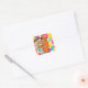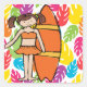 Un chica con pelo de brunette y una tabla de surf naranja con un fondo de hojas tropicales multicolores sobre pegatinas que coinciden con nuestras invitaciones y sellos postales para surfistas de Brunette Chica.