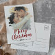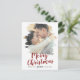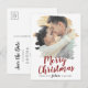 Esta foto de guardar la fecha de Navidad con un efecto de pinceladas rojas hace la tarjeta postal perfecta para una simple felicitación navideña para una pareja comprometida. El diseño único y artístico presenta su foto con pinceladas de pintura de acuarela y caligrafía moderna en rojo y blanco.