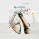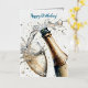 Una hermosa imagen ilustrada de una botella de champán vertida en una copa de cristal. El champán está burbujeante y brillante en la luz, con gotitas de líquido salpicando por ahí, creando un ambiente enérgico y de celebración.