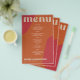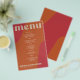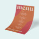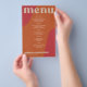 Abstract shapes retro vintage 70s style unique cheap budget wedding menu template flyer (advertising type of paper) with bold typography in a vibrant trendy modern red, beige and orange terracotta boho chic color palette. +++++++ Please note that all the colors are changeable. ++++++++++++ Suitable for informal casual stylish contemporary weddings. ++++++++++++++++ PLEASE READ THIS BEFORE PURCHASING! This is a cheap budget wedding card printed on a FLYER (advertising type of paper suitable for folded mailings). ++++ Please note that BUDGET PAPER IS THIN - You can upgrade to have this card printed on cardstock ++++ ENVELOPES NOT INCLUDED. +++ Double-check all the information and spelling of your text because you will receive exactly what you see - no one else will check anything before printing.