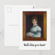 Esta postal muestra una pintura de una mujer con un vestido azul. El cuadro tiene un gran marco de madera, y la mujer dice: "Bueno, bendiga su corazón".