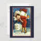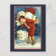 Ilustracion vintage de un niño feliz cargado con regalos de Navidad. El texto dice: ¡Deseos buenos! Las maravillosas tarjetas de Navidad dan una sensación de diversión de vacaciones anticuada. Disponible en dos tamaños de tarjetas con sobres, o en postales. ¡Compra uno o cien o más! Cuando compras a granel ahorras. Personalizable completo, añade un saludo, personaliza el contenido de tu corazón.