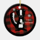 El búfalo se machacó en rojo y negro con un pequeño y dulce zorrillo negro y blanco con copos de nieve cayendo a su alrededor. Añade el nombre del bebé delante y personaliza la parte posterior con más detalle. El color de la parte posterior del adorno puede cambiarse a lo que desee.