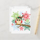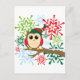 Un lindo búho de Navidades se perfila en una rama, rodeado de copos de nieve.