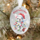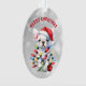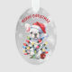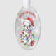 En este adorable adorable adorable adorable Bulldog blanco francés ha estado en la decoración navideña. Está envuelto en luces, y los adornos yacen a sus pies. El perro lleva un sombrero de Santa Claus rojo y blanco. El texto encima de la imagen dice "FELIZ NAVIDAD" en rojo. La imagen y el texto se colocan en un fondo de bokeh abstracto plateado. La parte posterior del adorno tiene la misma imagen, pero con el texto "AÑO NUEVO FELIZ" en verde.