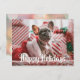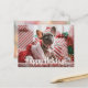 El Bulldog Francés de Navidad está sentado en una media de Navidad y rodeado de paquetes a rayas rojas y blancas. 'Felidades' está escrito en la parte frontal de la postal, pero puedes personalizar el texto para que diga lo que quieras.