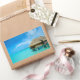 Pegatina de recuerdo rectangular de un bungalow sobre el agua en luna de miel en un complejo de lujo situado en la laguna azul clara de la isla pacífica de Bora, cerca de Tahití, en el archipiélago de la Polinesia Francesa.